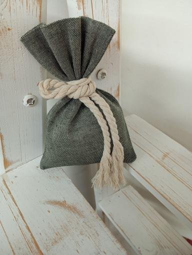 Μπομπονιέρα πουγκι σε απόχρωση λαδι , δεμένο με βαμβακερό κορδονι ιβουαρ 0.8mm,Η τιμή αφορά μία ολοκληρωμένη μπομπονιέρα μαζί με τα κουφέτα, Τα κουφέτα που συμπεριλαμβάνονται είναι 7τμχ κλασσικά αμυγδάλου ή πλακέ σοκολάτας bijoux ή crispy της εταιρείας Χατζηγιαννάκη