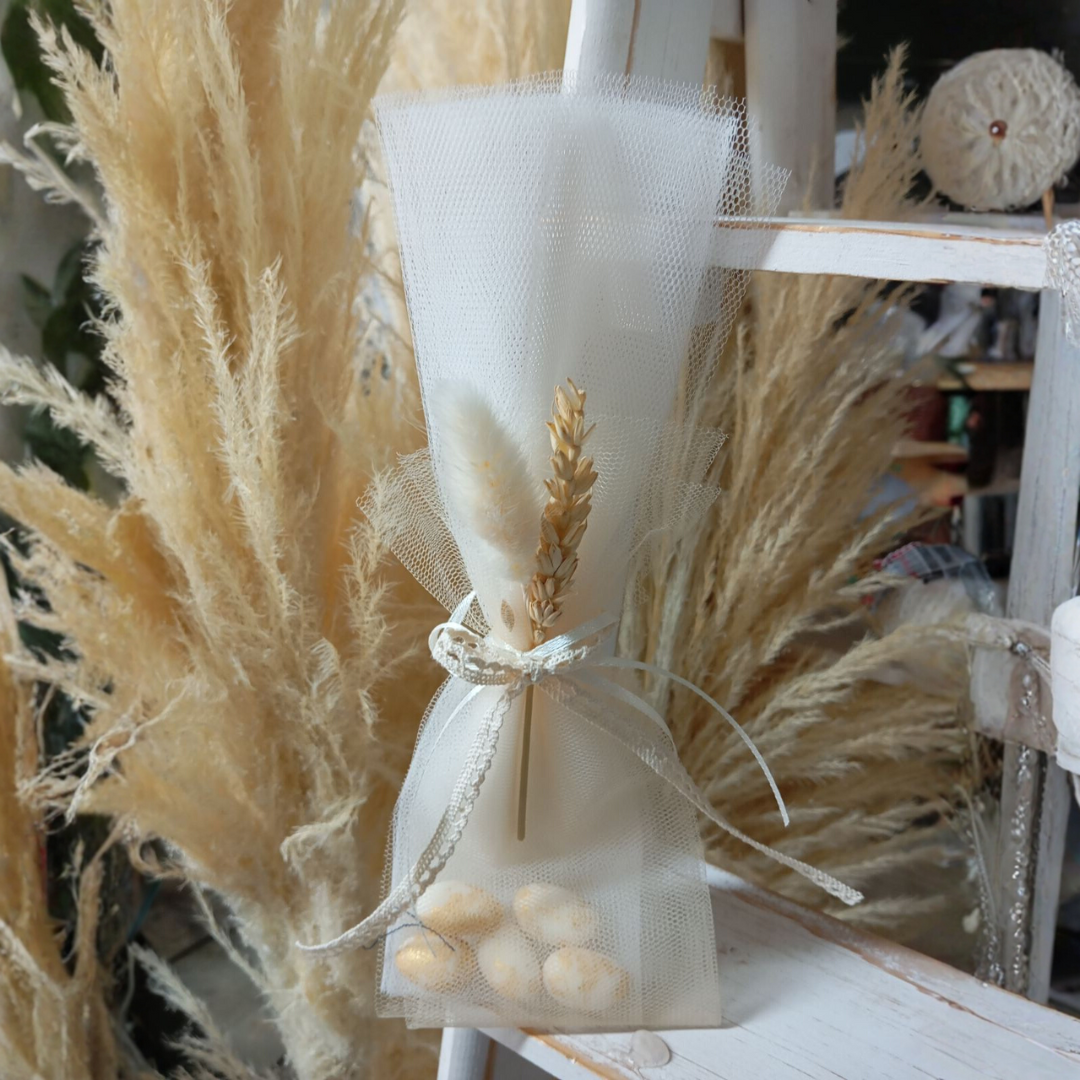 Μπομπονιέρα από εκρού τούλι, δεμένη με λεπτή εκρού δαντελίτσα και διακοσμημένη με αποξηραμένα στοιχεία (στάχυ & lagurus). Περιέχει κουφέτα αμυγδάλου. Ιδανική για ρομαντικό, boho ή rustic ύφος γάμου.