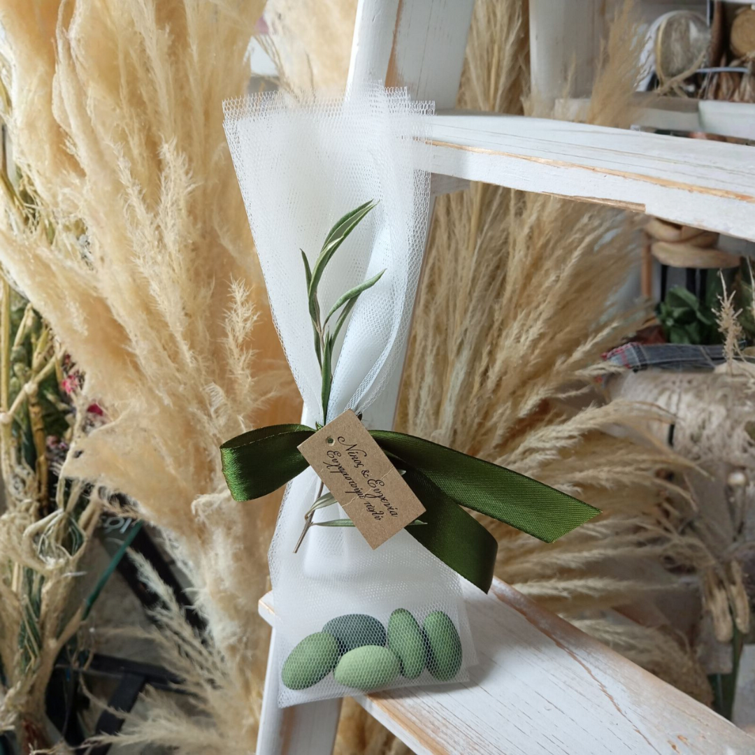 Μπομπονιέρα από λευκό τούλι, δεμένη με εντυπωσιακή πράσινη σατέν κορδέλα και διακοσμημένη με φυσικό κλαδί ελιάς. Περιέχει κουφέτα αμυγδάλου. Ιδανική για κομψό, minimal και mediterranean ύφος γάμου.
