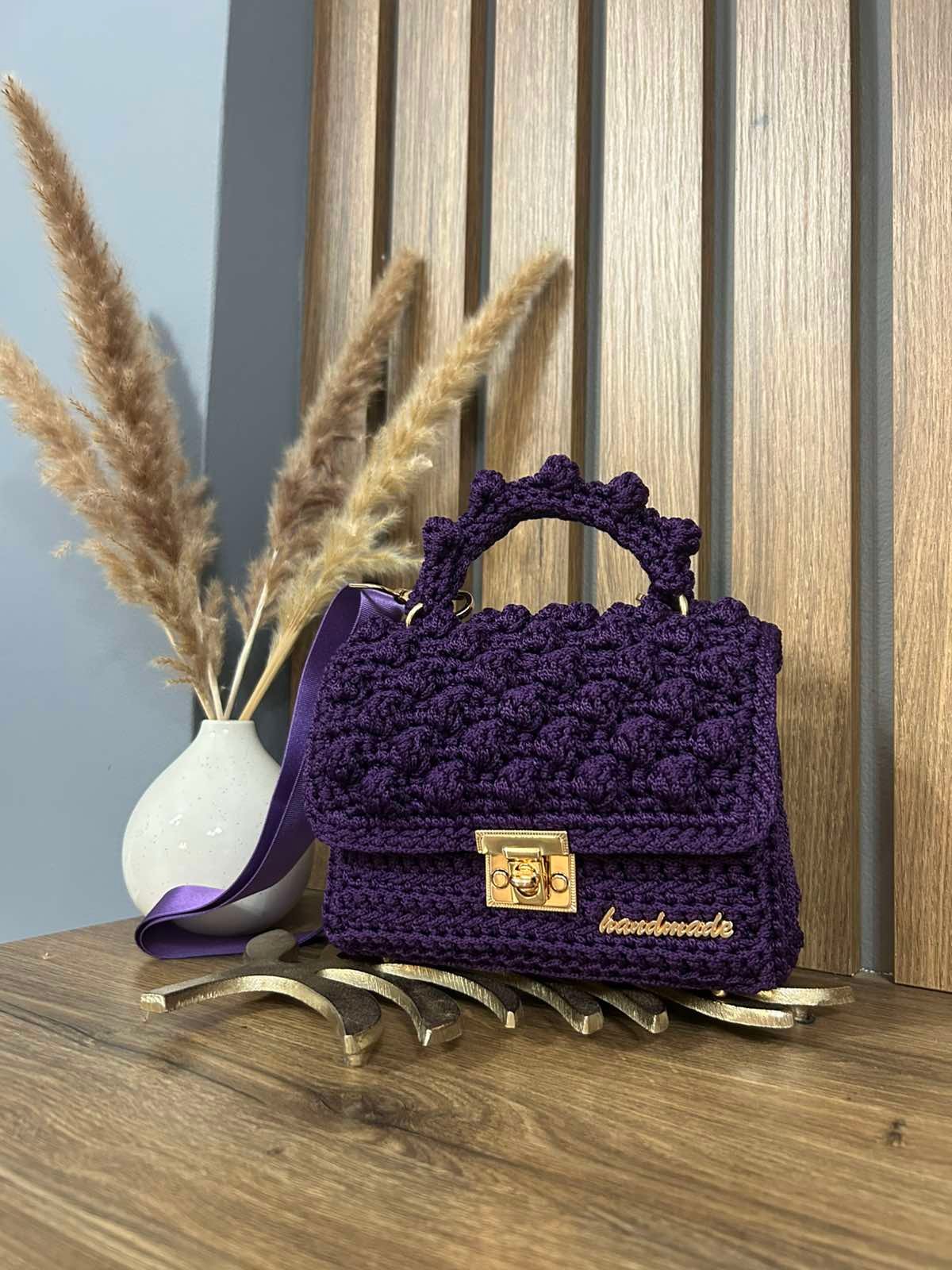 Χειροποίητη πλεκτή τσάντα μωβ με χρυσές λεπτομέρειες