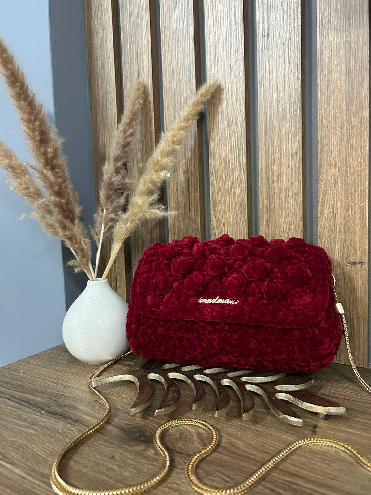 Χειροποίητη τσάντα από βελούδινο νήμα σε μπορντό χρώμα, με υφή 3D ροζέ και χρυσή μεταλλική αλυσίδα. Μαλακή αφή, κομψό design και λεπτομέρεια “handmade” στο μπροστινό μέρος.