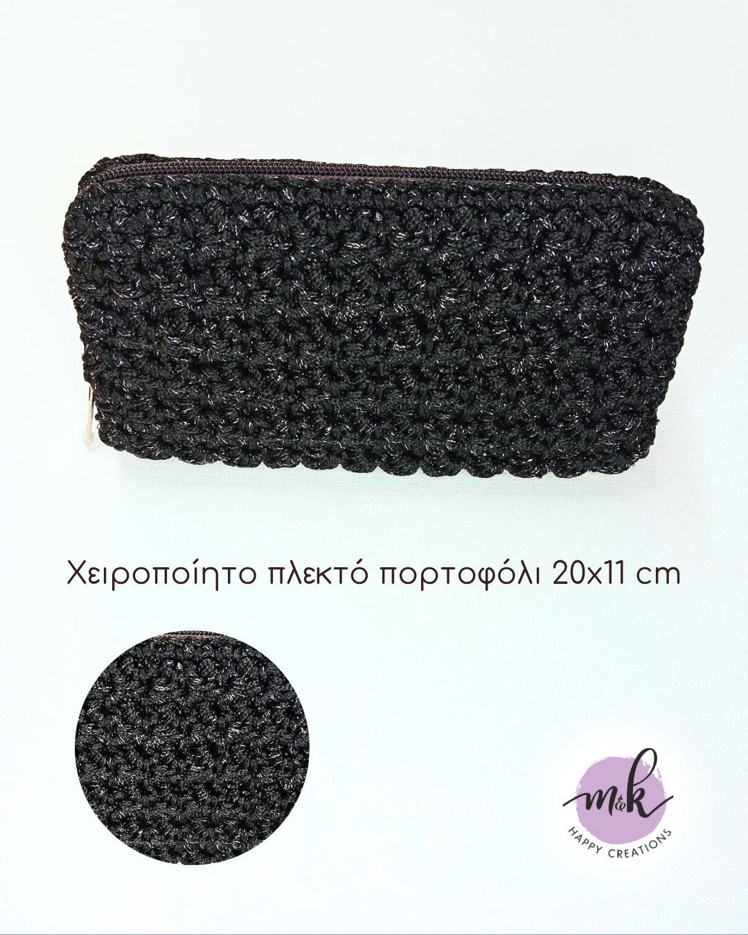 Κομψό χειροποίητο πλεκτό πορτοφόλι σε μαύρη απόχρωση με ασημόκλωστη για διακριτική λάμψη. Διαστάσεις 20×11 cm, με φερμουάρ σε μεταλλικό τόνο. Ιδανικό για βραδινές εξόδους ή ως elegant δώρο.