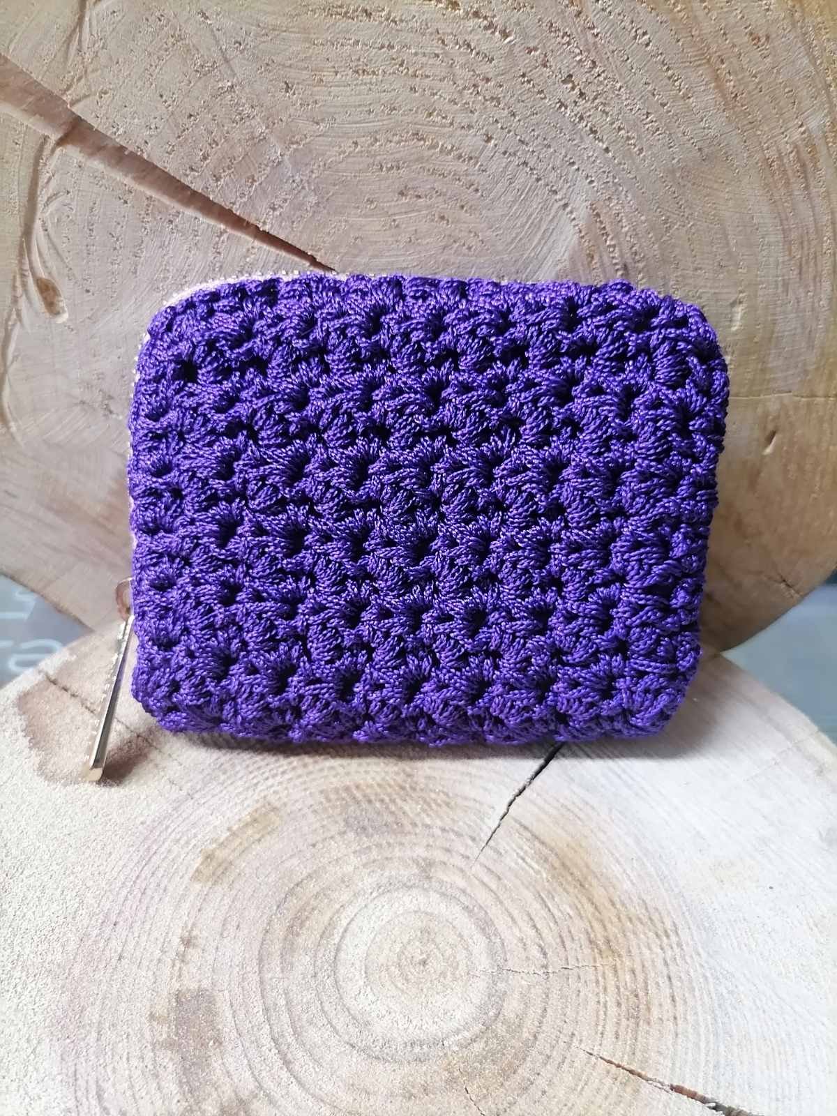 Πλεκτό πορτοφόλι σε έντονο μωβ χρώμα, φτιαγμένο στο χέρι με ποιοτικό νήμα και φερμουάρ. Κομψό και πρακτικό για κάθε περίσταση.