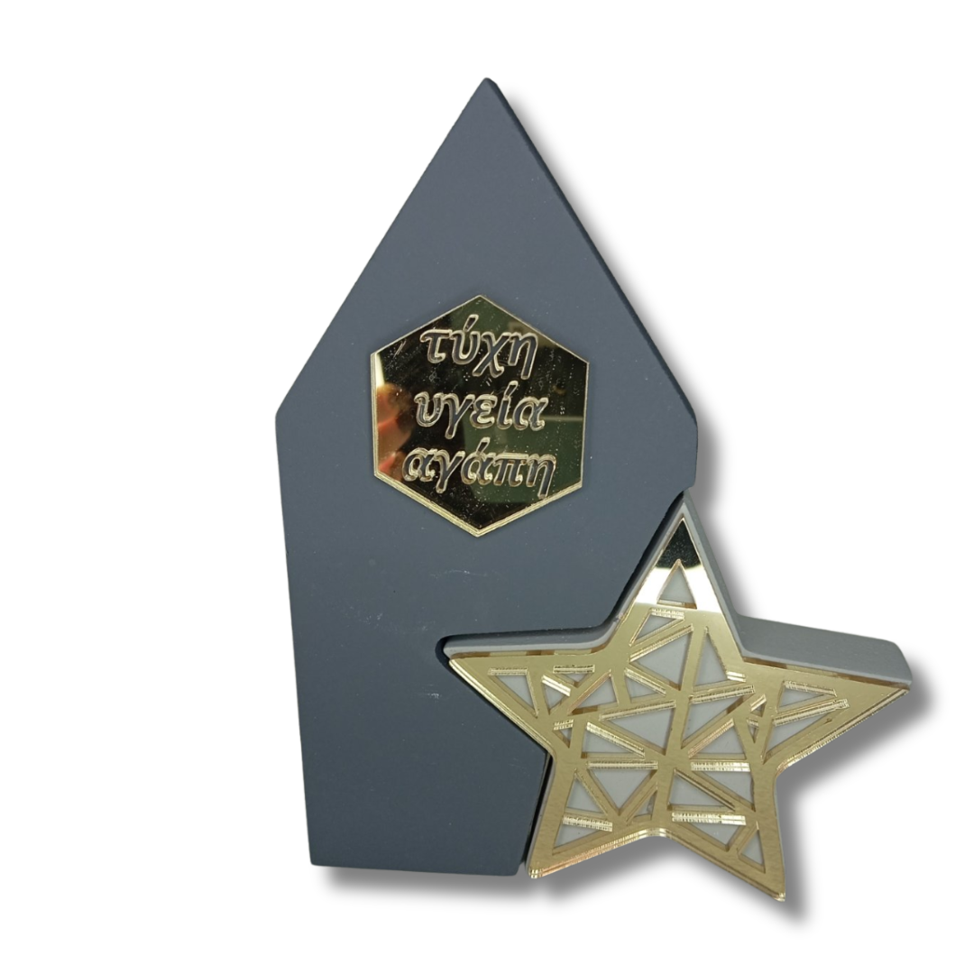 Επιτραπέζιο γούρι σε σχήμα σπιτιού με χρυσό αστέρι και μεταλλική επιγραφή “Τύχη – Υγεία – Αγάπη”. Ύψος 17cm, πάχος 1,5cm.