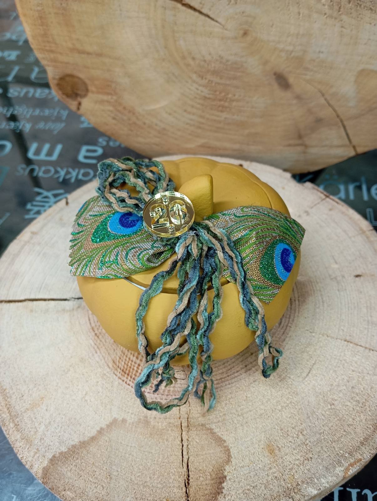 Επιτραπέζια διακοσμητική κολοκύθα σε μουσταρδί απόχρωση, διακοσμημένη με φαρδιά κορδέλα με μοτίβο παγωνιού, πολύχρωμα κορδόνια και χρυσό στοιχείο “2026”.