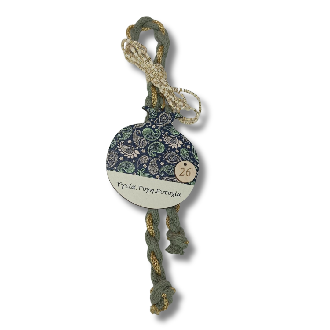 Ξύλινο γούρι τοίχου σε σχήμα ροδιού με μπλε-πράσινο paisley σχέδιο, πλεκτό κορδόνι σε χακί και χρυσό, διακοσμημένο με φιόγκο.