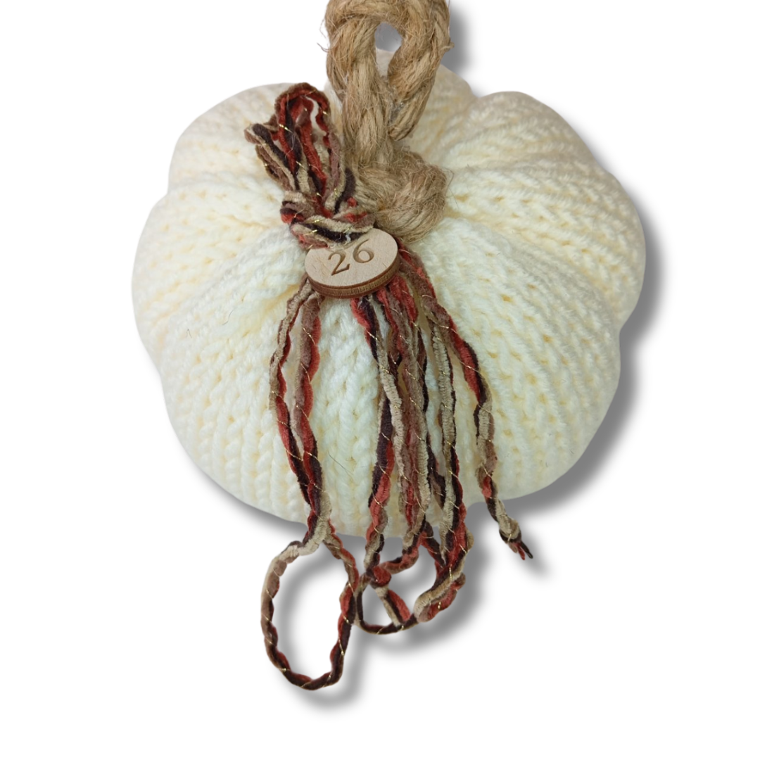 Χειροποίητη διακοσμητική κολοκύθα από πλεκτό ύφασμα σε υπόλευκο χρώμα, δεμένη με φυσικό σπάγκο και πολύχρωμα κορδόνια σε αποχρώσεις του κόκκινου και του καφέ. Ιδανική για rustic ή φθινοπωρινή διακόσμηση και ως δώρο για το σπίτι.
