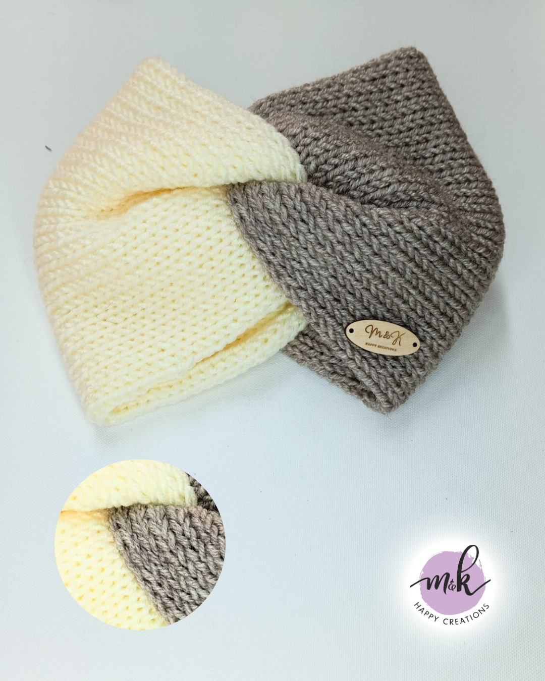 Χειροποίητη πλεκτή κορδέλα για τα μαλλιά σε διχρωμία, Ζεστή, μαλακή και ελαστική — ιδανική για τους χειμερινούς μήνες ή ως στιλάτο δώρο.