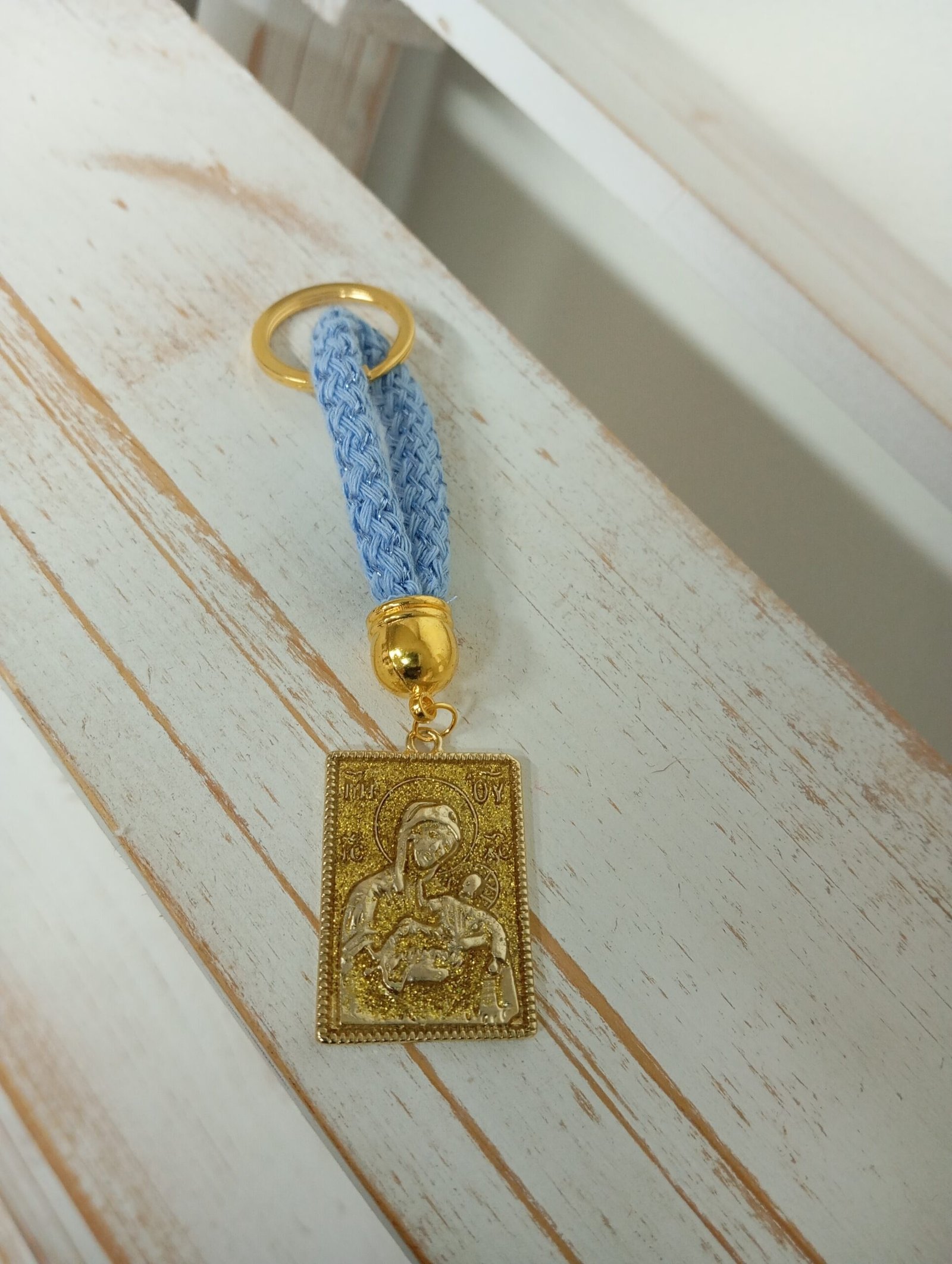 Πολυτελες Μαρτυρικό μπερλόκ βάφτισης, αποτελούμενο από κορδόνι βαμβακερό αποχρωσης [Σιελ] εξαιρετικής ποιότητας με Σιελ λαμπερες λεπτομέρειες, και στο τελείωμα του μεταλλικό στοιχείο πώς συμβολίζει την παναγία