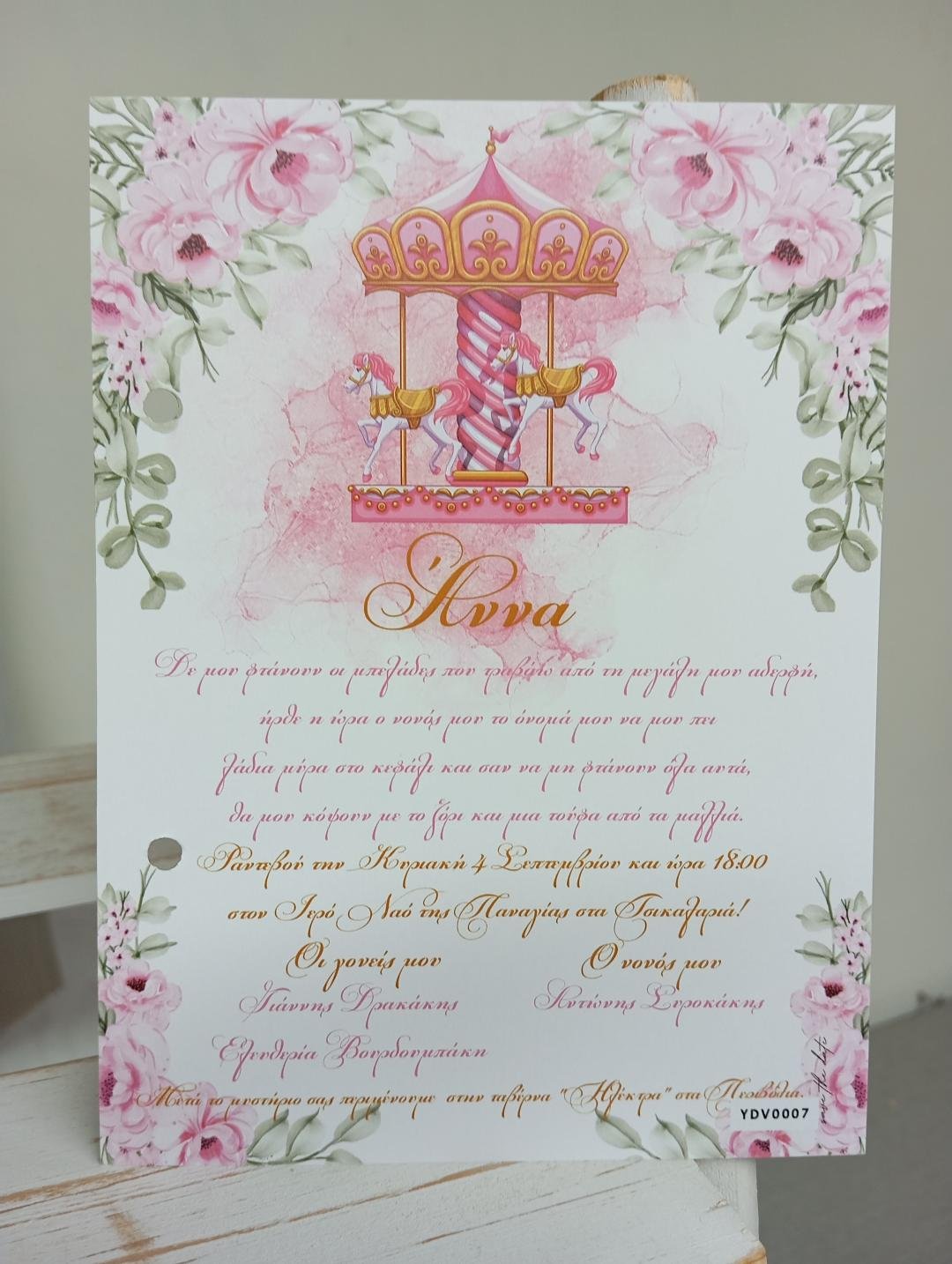 Προσκλητυριο Βαπτισης Με θεμα { ένα ροζ καρουζέλ και λουλούδια }